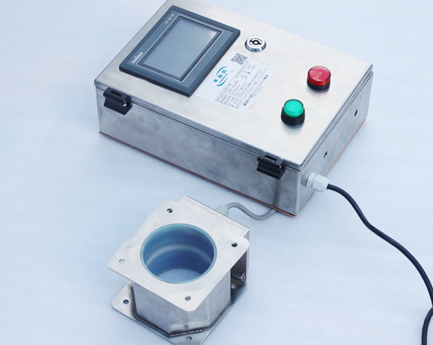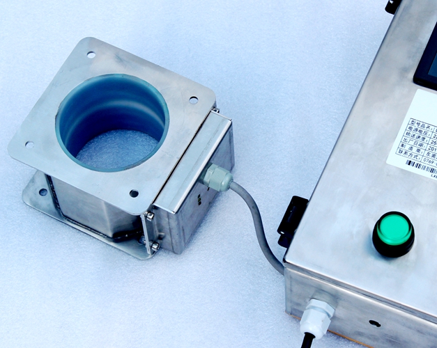原料從料斗或送料器自由下落進(jìn)入金屬分離器,如果沒有金屬雜質(zhì),原料會(huì)直接通過金屬分離器流向下端的出料口。如果檢測器檢測到原料中含有金屬,那么控制器立刻啟動(dòng)分離板將金屬物和部分原料一起導(dǎo)向側(cè)面的排料口,然后分流板迅速恢復(fù)至正常的位置,分流板速度可調(diào),金屬分離器的檢測精度也可根據(jù)生產(chǎn)需要調(diào)節(jié),最小可檢測并分離出Φ 0.2mm的金屬顆粒。